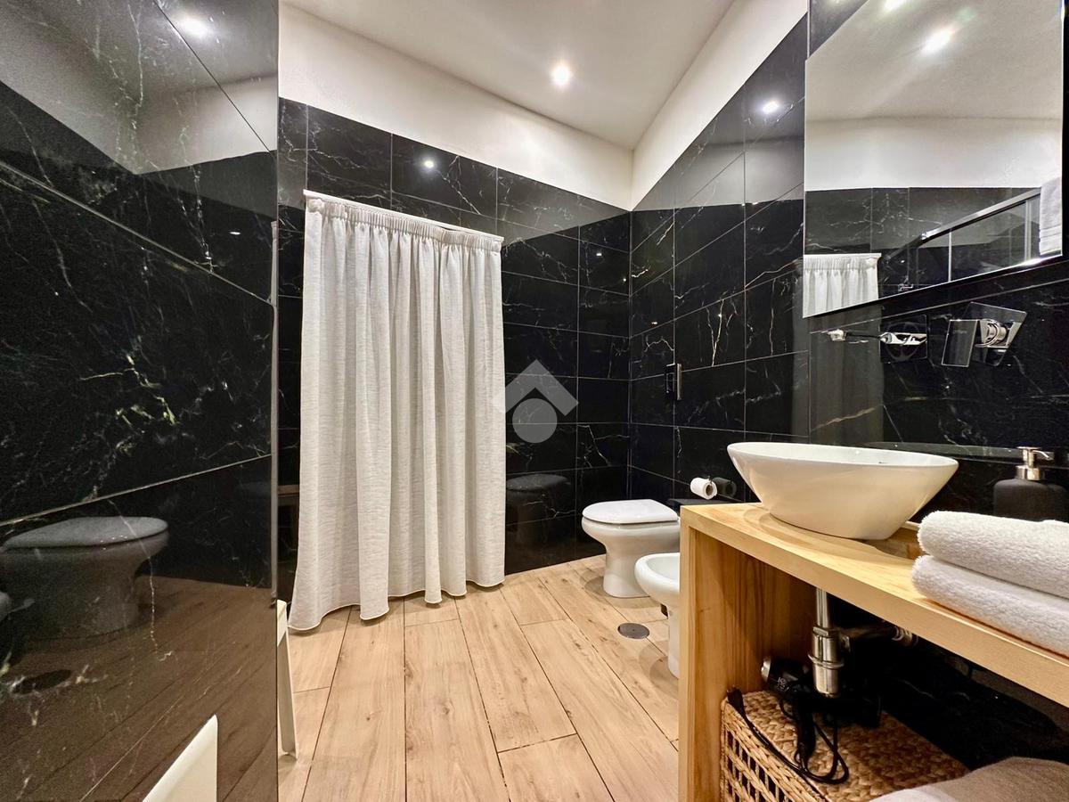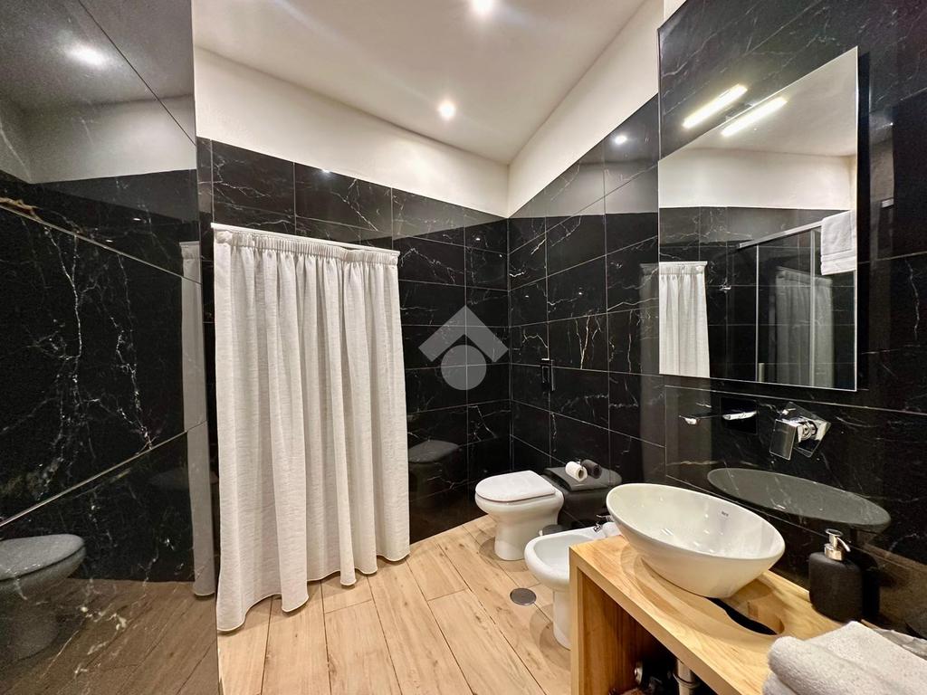 I bagni presentano rivestimenti moderni effetto marmo e legno, sanitari sospesi e docce in vetro.